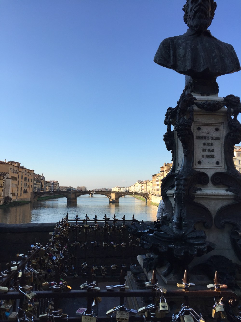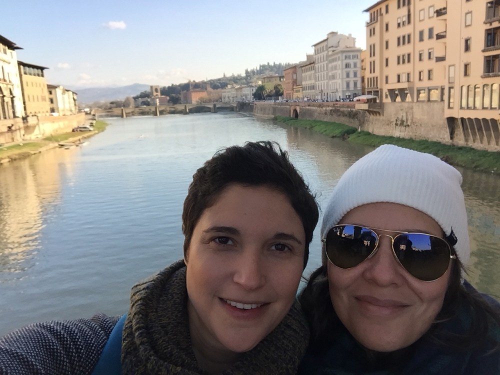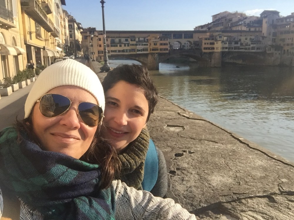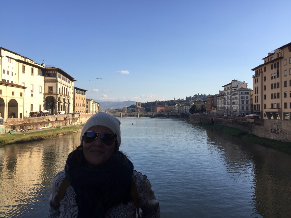 We walked along the river to the Ponte Vecchio. The sun was finally shinning down on us after all the grey skies and rain in London. The views of the buildings from the river were beautiful. We took our standard selfies and then headed into the city.